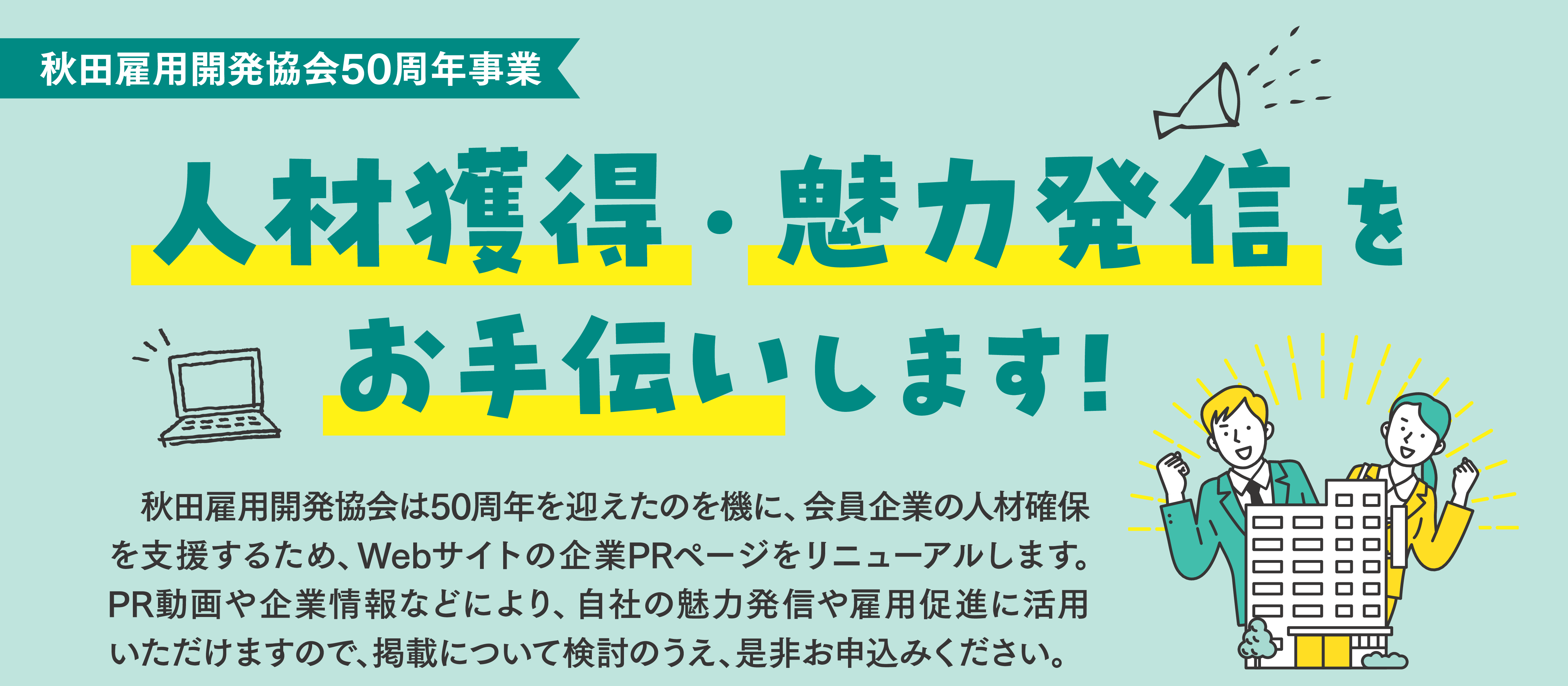 投稿日:2024.09.04 更新日:2024.09.04 秋田雇用開発協会は50周年を迎えたのを機に、会員企業の人材確保を支援するため、Webサイトの企業PRページをリニューアルします。 PR動画や企業情報などにより、自社の魅力発信や雇用促進に活用いただけますので、掲載について検討のうえ、是非お申込みください。 チラシはこちらから 申込みはこちらから